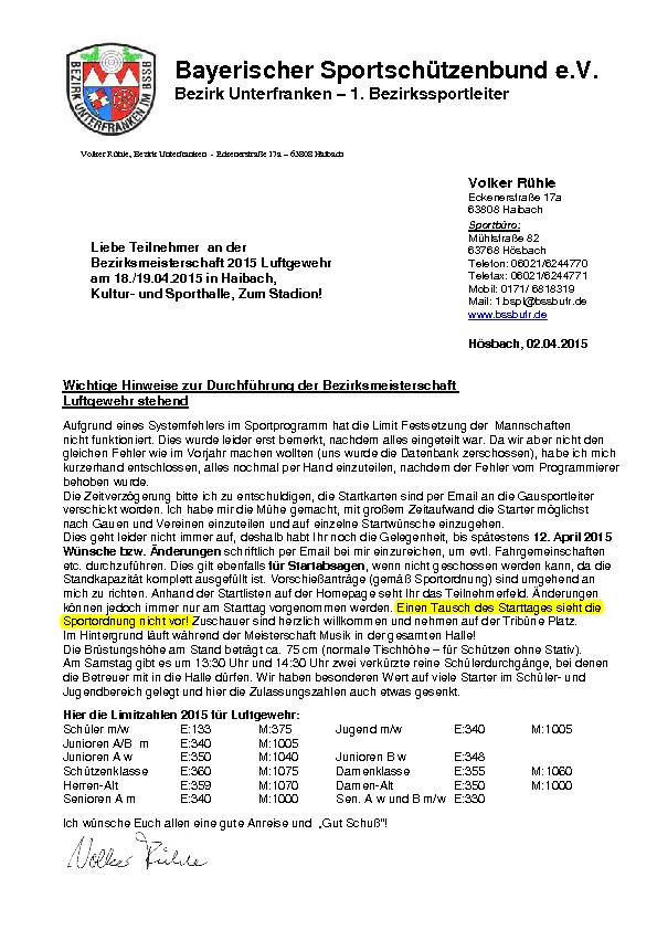 - Wichtige Hinweise zur Durchführung der Bezirksmeisterschaft 2015 Luftgewehr stehend in Haibach -